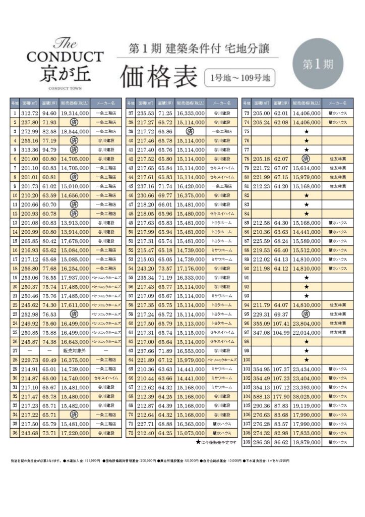 ■「The CONDUCT 京が丘」団地概要 ●事業名称/「The CONDUCT 京が丘」●所在地/大分市大字松岡字二又857番1他●交通/大分バス「京が丘センターハウス」バス停390〜770m(徒歩約5〜10分)●開発総面積/174,309㎡●全体区画数/約400区画●区画面積/200.99㎡〜588.70㎡●開発許可番号/大分市指令第1204号(令和6年7月4日)●造成工事/令和7年8月末(第8工区工事完了予定)●用途地域/市街化調整区域(第1種低層住居専用地域に準ずる)●地目/宅地●建ぺい率/50%●容積率/100%●道路/幅員4m~12mアスファルト舗装●供給施設/電力:九州電力 上水道:大分市上水道 下水道:公共下水 雨水:側溝 CATV:JCOM●私道負担/無し●水道加入金/154,000円●団地設備維持管理基金/300,000円●集会所建設基金/50,000円●自治会結成基金/10,000円●下水道負担金/1㎡あたり350円●事業主・土地売主/コンダクト株式会社 北九州市小倉北区浅野2-17-38/宅地建物取引業者免許:国土交通大臣(5)第6957号●土地売主・建物請負:(株)一条工務店、住友林業(株)、セキスイハイム九州(株)、積水ハウス(株)、(株)谷川建設、トヨタホーム九州(株)、パナソニックホームズ大分(株)、ミサワホーム九州(株)■《第1期》 ●総区画数/109区画 ●販売区画数/59区画 ●区画面積/200.99〜354.55㎡ ●販売価格/13,913,000円(1区画)〜23,804,000円(1区画) ●最多販売価格帯/1,500万円台(29区画) ■建築条件付宅地分譲/土地売買契約後ただちに建築協議をしていただき、3ヶ月以内に上記ハウスメーカーと建築請負契約を結ぶことを条件に販売いたします。この期間内に建築しないことが確定したときには、土地売買契約は白紙となり、受領した金銭は全額無利息でご返還いたします。※この概要は、2025年3月8日現在のものです。※防犯カメラ等の共有設備等については、実現後に地元自治会へ帰属を予定しております維持管理費(年間:6,000円/世帯(予定))をご負担いただく予定です。地元自治会やサービス提供会社との協議や判断等により、サービスの中止や撤去等により、サービスが実現しない場合がございます。※詳しくは販売スタッフにお尋ねください。
