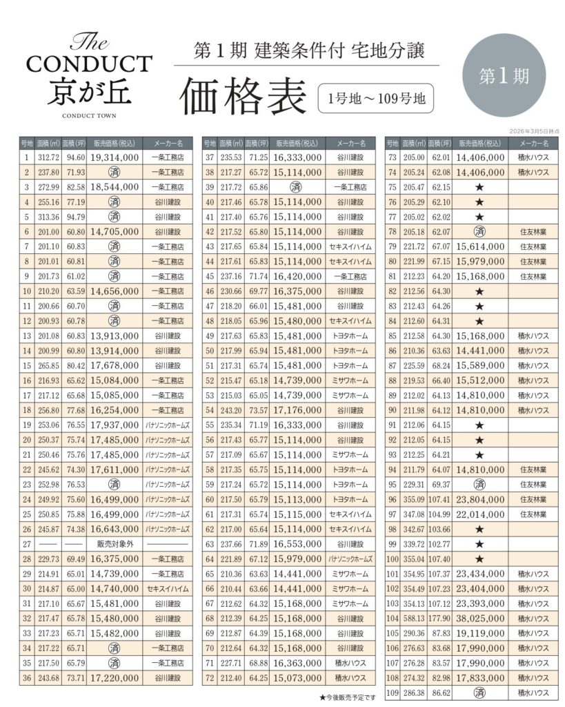 (株)一条工務店 ■《第1期》 ●総区画数/109区画 ●販売区画数/80区画 ●区画面積/200.99~588.13㎡ ●販売価格/13,913,000円(1区画)~38,025,000円(1区画) ●最多販売価格帯/1,500万円台(35区画) ■
